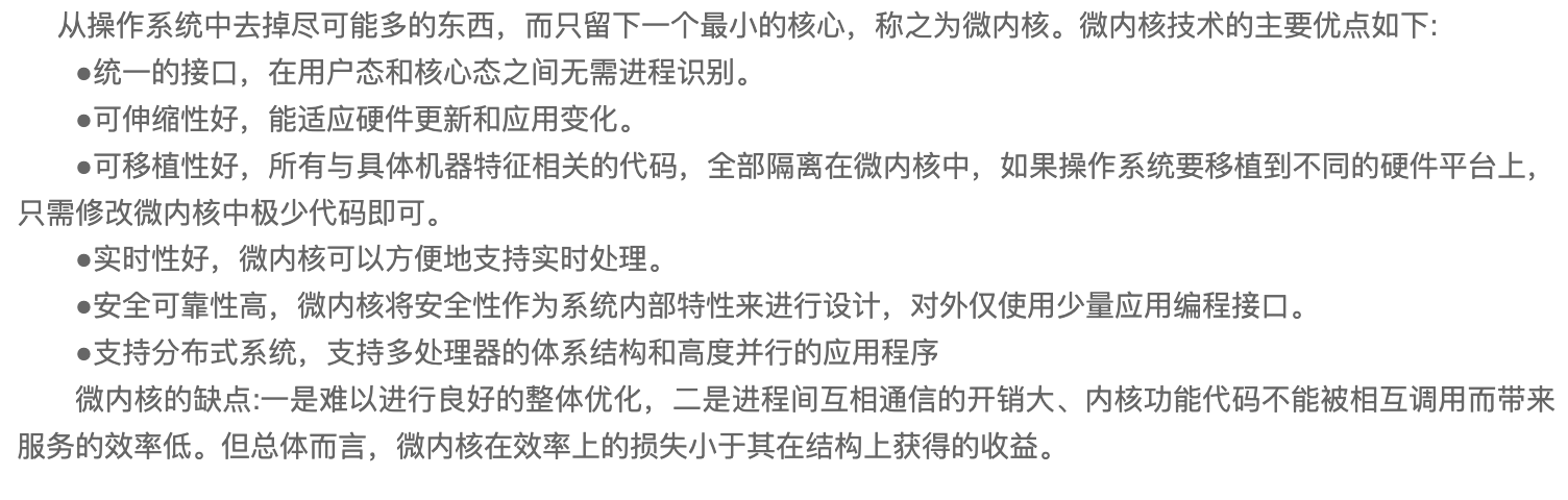 - 灵活性和可扩展性: 由于微内核 OS 的许多功能是由相对独立的服务器软件来实现的,当开发了新的硬件和软件时,微内核 OS 只需在相应的服务器中增加新的功能,或再增加一个专门的服务器。与此同时,也必然改善系统的灵活性,不仅可在操作系统中增加新的功能,还可修改原有功能,以及删除已过时的功能,以形成一个更为精干有效的操作系统。