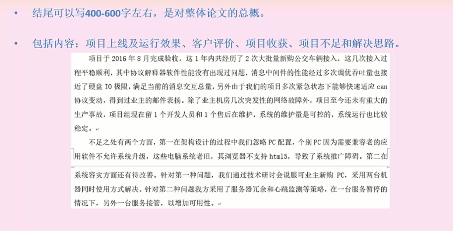 - 第一段:项目上线及运行效果、客户评价、项目收获